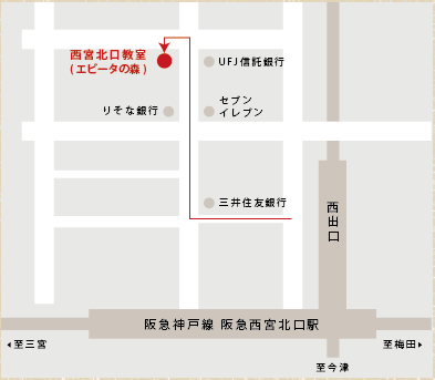 西宮北口教室〒662-0832西宮市甲風園1丁目8-11 how to access 阪急西宮北口駅 北改札口を出て 西出口降りる 駅前公園を通り抜け三井住友銀行左の道路を北へ60m UFJ信託銀行の前